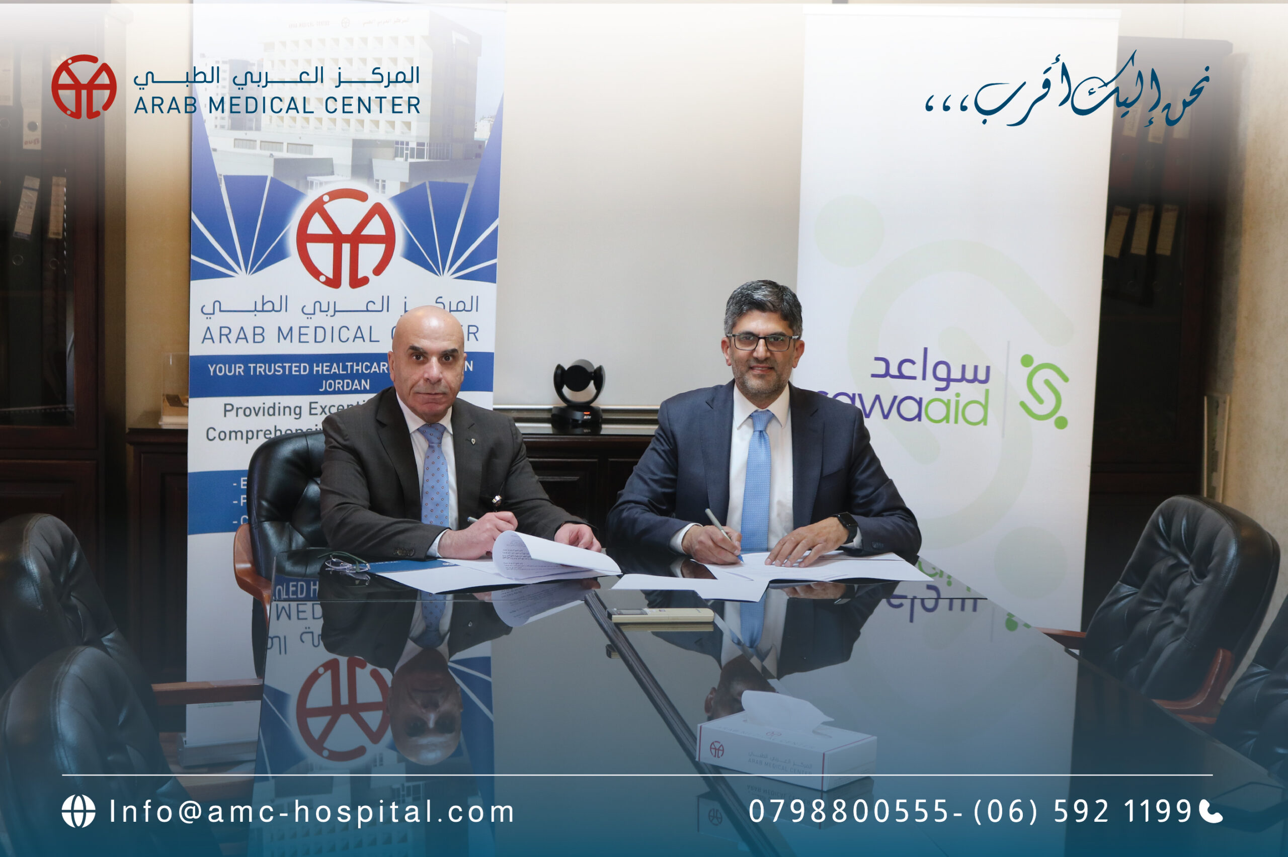 قام السيد فراس رحّال / الرئيس التنفيذي في المركز العربي الطبي بتوقيع اتفاقية تعاون مع منصة سواعد لتكنولوجيا الرعاية الصحية ممثلة بالصيدلاني سيف حدادين / الرئيس التنفيذي للمنصة؛ تتضمن التعاون المشترك لتقديم حلول تمريضية وصحية منزلية للمرضى والمراجعين ضمن منصة تكنولوجية متطورة وتطبيق هواتف خليوية خاص بالمنصة. وتأتي هذه المبادرة ضمن جهود المركز في تحقيق شعاره المتجدد: “نحن إليك أقرب،،،” على أرض الواقع؛ وذلك عن طريق توفير حلول جديدة ومبتكرة وتقدّمية لكافة ومختلف إحتياجاتهم الصحية والطبية المتنوعة، وإختصار المسافات عليهم وتذليل أي صعوبات في طريق حصولهم على الرعاية الطبية والعناية الصحية المتميزة التي يستحقونها ويقدمها المركز لكافة مراجعيه ومرضاه في كافة التخصصات ومن كل الأقطار.