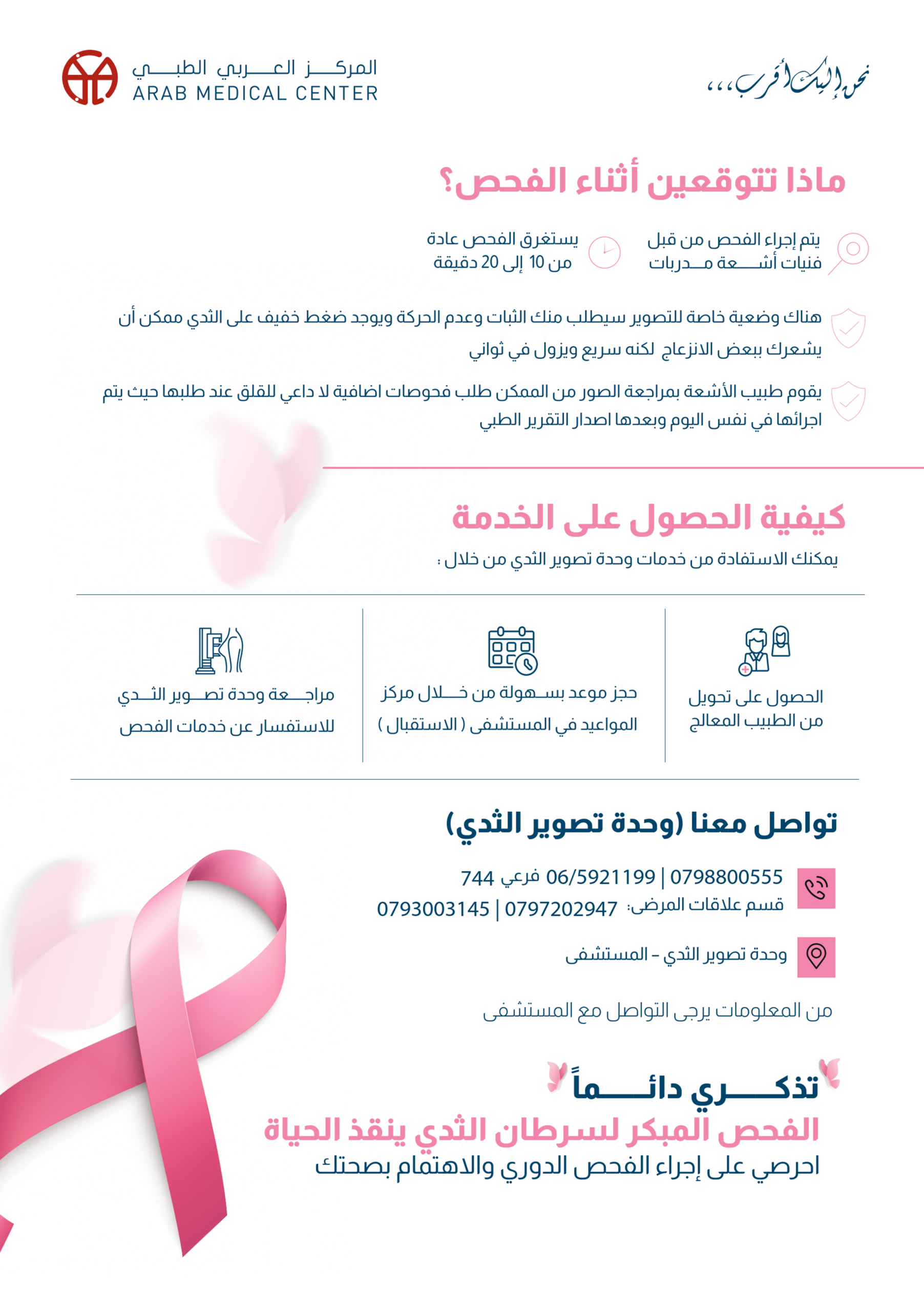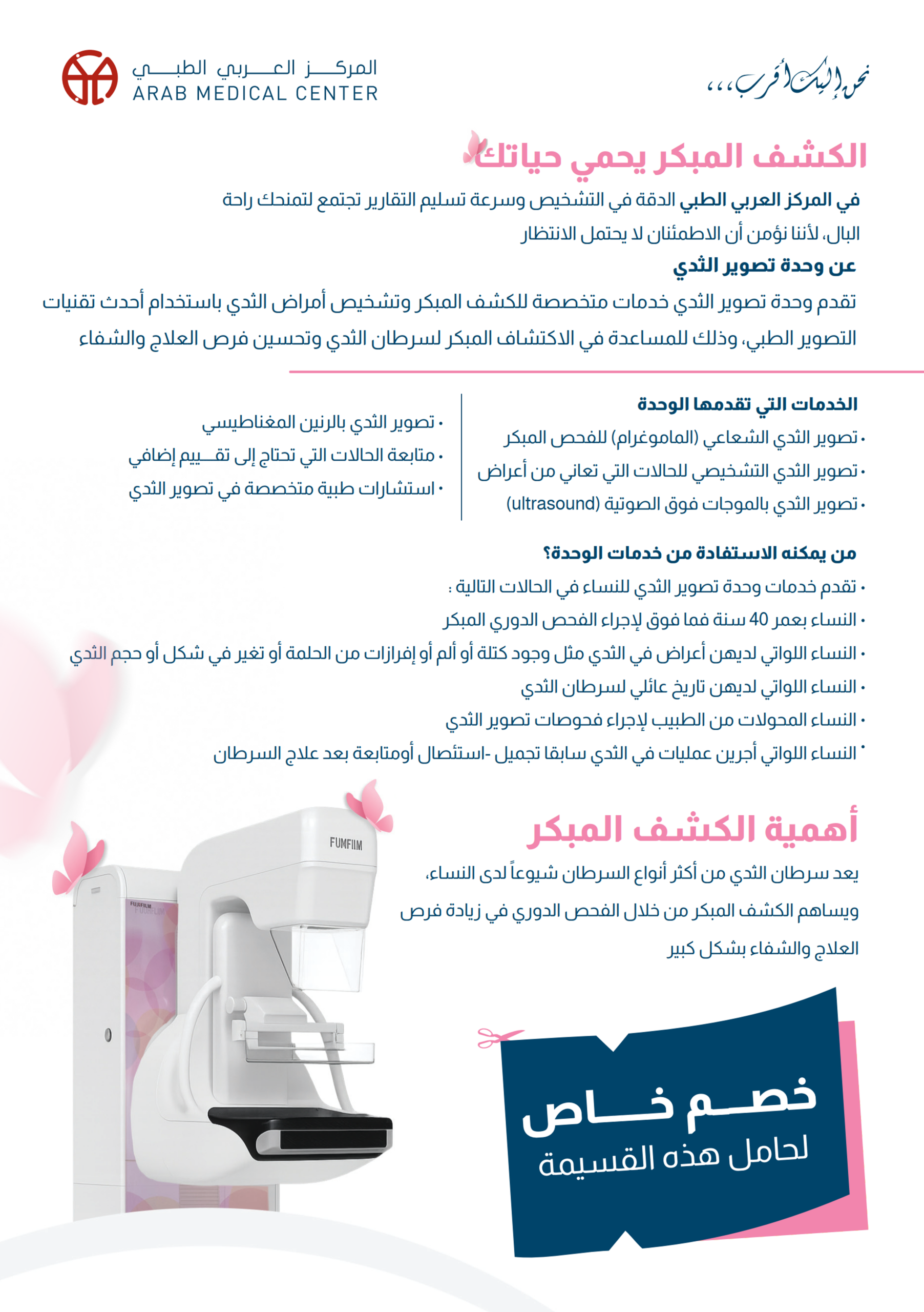حصلت وحدة تصوير الثدي (BIU) في المركز العربي الطبي على هذا الاعتماد، إلى جانب التزامها بالمعايير الداخلية للمستشفى، مما يضمن تقديم خدمات تشخيصية دقيقة وآمنة وتجربة مريحة وداعمة لجميع المرضى والمراجعين.